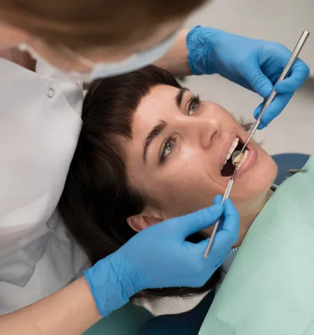 Врач проводит визуальную оценку состояния зубов и дёсен, выявляет участки оголённого дентина, кариозные полости, признаки эрозии эмали.